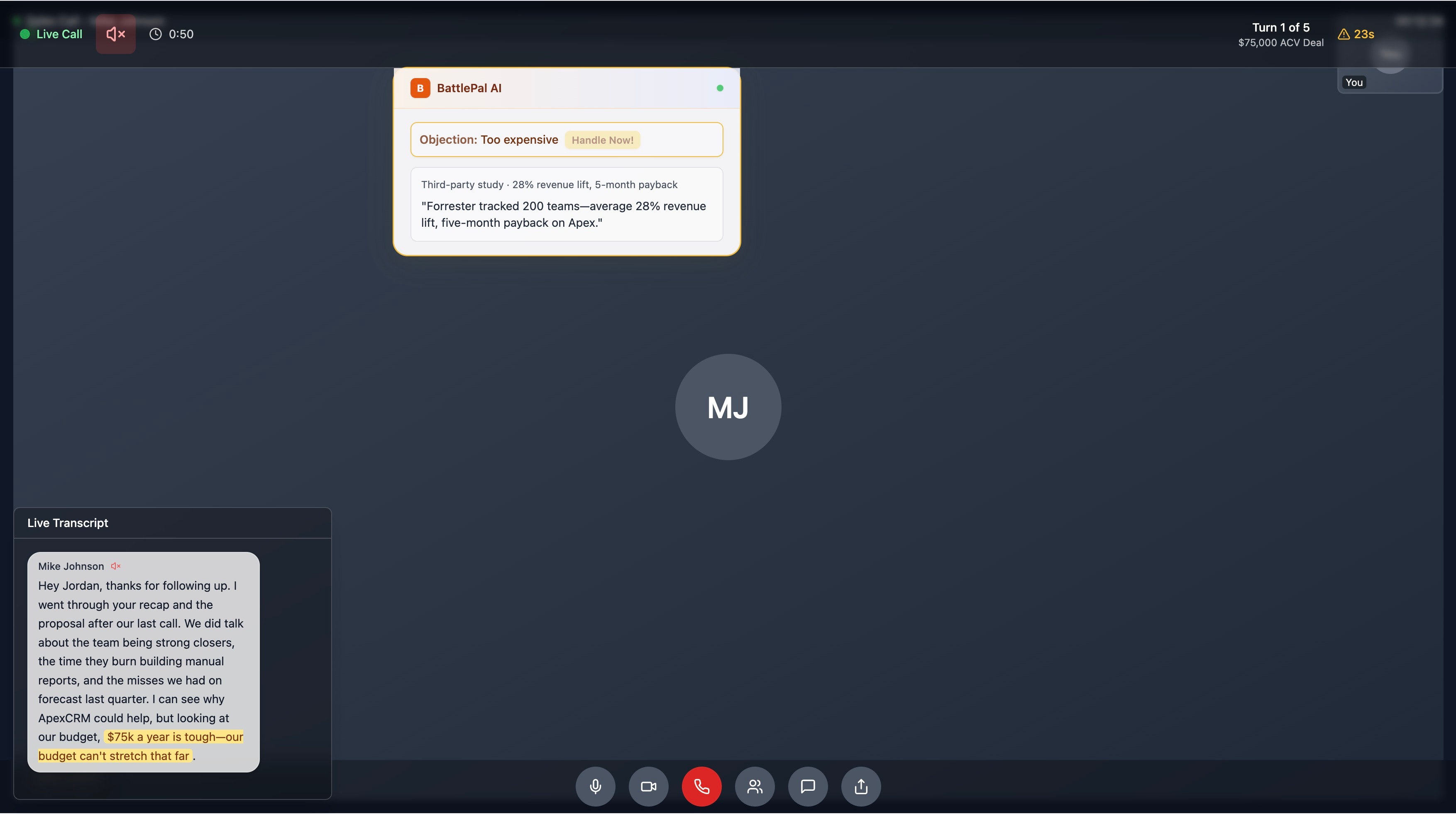 BattlePal is a desktop overlay that listens to live sales calls and provides proactive, realtime battle cards to handle objections with confidence.